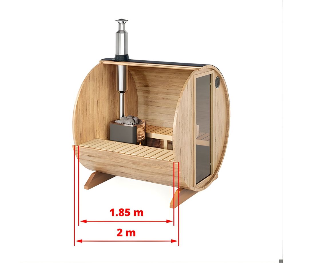 En kompakt og velafbalanceret saunamodel, der udnytter pladsen optimalt. Med en diameter på 2 meter rummer den op til 4 personer uden at fylde unødigt i haven.