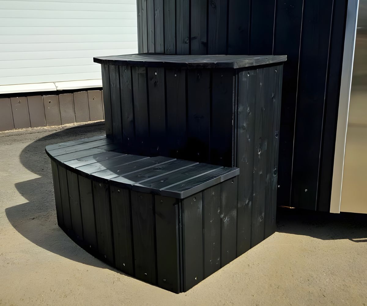 Trappen er designet med integreret plads til sandfilter, som skjules diskret for et mere rent og harmonisk udtryk. Ekstra bred og stabil adgangstrappe, der gør det nemt og sikkert at komme i og op af vildmarksbadet.